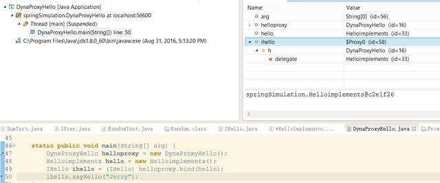 我们在调试器里观察IHello ihello = (IHello) helloproxy.bind(hello)这行语句返回的ihello变量。虽然它的静态类型是IHello,但请注意,在调试器里观察它的实际类型,并不是Helloimplements的实例,而是JVM给我们加过工的,包含了我们在invoke方法里手写的那行日志记录代码。这个ihello类型为$Proxy0。